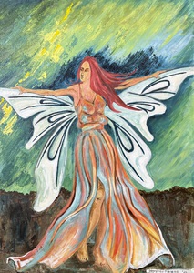2025Noorderlicht, met halfgodin. Nimf sierlijk bewegend voor het noorderlicht.